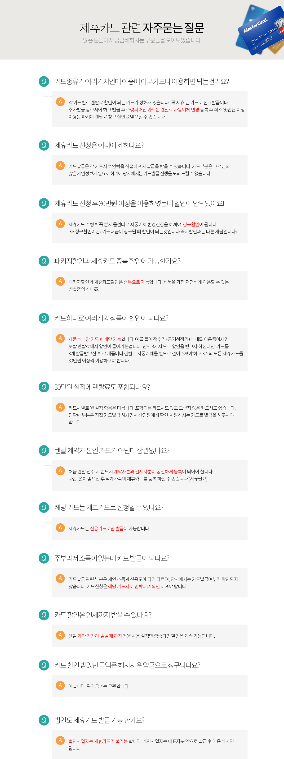 - 전월 이용금액 50만원 이상 100만원 미만 시 렌탈료 10,000원 추가 할인